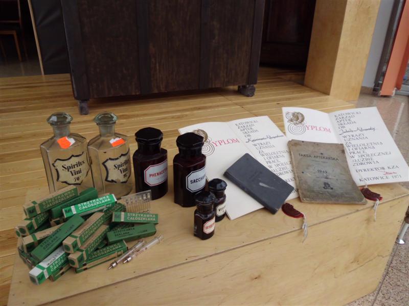 Na ekspozycji prezentowane są dawne naczynia apteczne, pochodzące z różnych okresów, wykonane ze szkła przeźroczystego i barwnego, metalu oraz ceramiki. Zobaczyć można moździerze, strzykawki szklane oraz sita służące do suszenia i przechowywania ziół leczniczych. Udało się również zgromadzić kolekcję wag stołowych oraz komplety odważników różnych typów (tu na uwagę zasługują odważniki poniżej 1 grama). Uzupełnieniem wystawy są dyplomy i dokumenty branżowe takie jak: taksa aptekarska, podręczny receptariusz czy vademecum drogisty.
